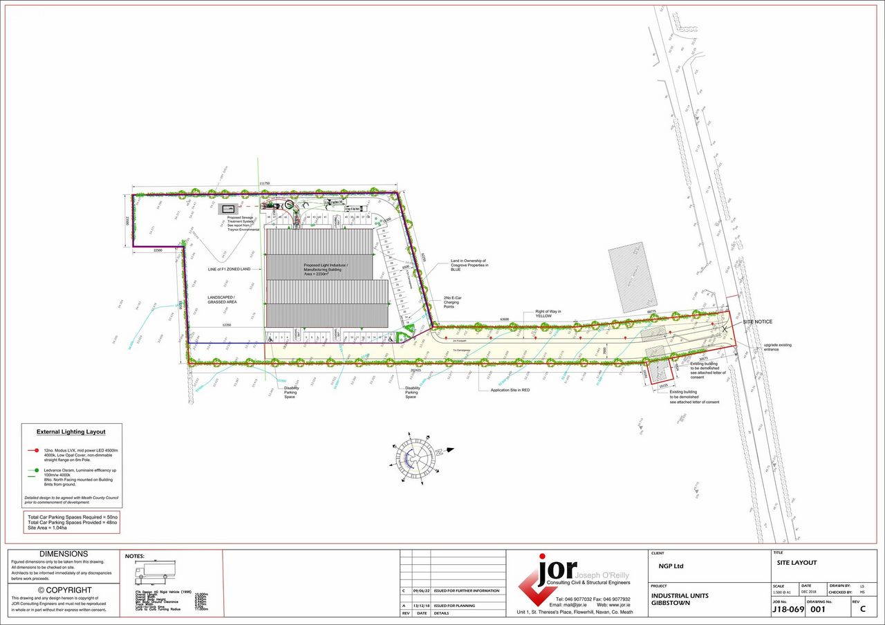 Site extending to 1.04 hectares / 2.56 acres approximately being the lands contained in folios MH59084F & MH64119F. Planning permission has been granted for the construction of a building with a maximum height of 7.59 m (gross floor area: 2,230 square metres) for use for industrial purposes including the manufacture of plastic profiles and the processing of end of waste redundant plastic products for use as raw materials in the manufacturing process for which a Waste Facility Permit has been granted; the demolition of a derelict house and shed, the upgrading of the existing vehicular access from the Kilberry Road (R163), internal roads; an attenuation pond, car parking, loading bays and an ancillary wastewater treatment system and all associated site development and landscaping works on a site of 1.04 ha. The hours of operation use of the building hereby permitted shall operate 24 hours,7 days a week and. Deliveries and collections from the unit shall be restricted to between the hours of 07.00 to 19.00 Monday to Sunday.